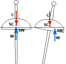 | Siły na żaglu mogą być tak duże, że dojdzie do sytuacji przedstawionej na Rys.3. SC i SW leżą na jednej linii. Siły C i W działają wzdłuż jednej prostej. Ramię d=0. Moment prostujący Mp=0. Jest to stan równowagi chwiejnej. Jeżeli w tym momencie wywiesimy się, balastując za burtą, uratujemy się przed wywrotką. Zmniejszy się kąt przechyłu O, jacht powróci w zakres stateczności stabilnej z dodatnim momentem prostującym. Można poluzować szoty żagli - zmniejszy to moment M, przechył zmniejszy się i też skutek będzie pozytywny. |